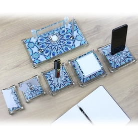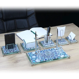 | İçerik: Kalem Seti, Telefon Standı, Küp Notluk, Notluk, Kalemlik, Kartvizitlik, Özel Lacivert Deri Kutu |